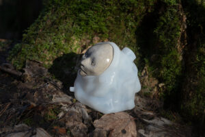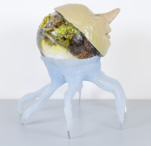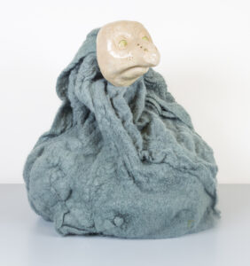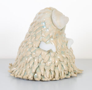 These ceramic creatures, mysterious and benevolent looking, are staged in what the artist imagines as a mixture between a far in the future world and a parallel reality to our own time. The main difference between our society and this powerfully evocative one is relational, and it deals with the idea of love. In this context love is not although taken as the shared common meaning of this term in nowadays world, Omann wants instead “to suggest a kind of future way of living and loving, that goes beyond the ways we have been taught through our collective conditioning” and places this utopia in a green and lush future that somehow reminds of the travels, reflections and atmospheres of Wells’s novella The Time Machine. It is peculiarly on point, then, the strong connection between these works and science fiction and the political undertones of both this exhibition and the best results of this literary genre. Science fiction has always harboured such mighty creative potential: allowing us to contemplate possible realities and relations. To imagine the future of mankind mirrored by the sociopolitical and inter-relational analysis of the present, and looking “beyond our current societal structures and formats” is precisely what Omann asks us to do by looking at this exhibition.