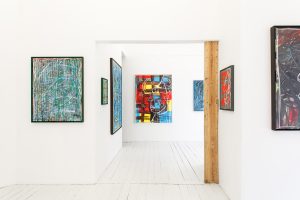 Neither fully figurative nor completely abstract, the paintings by Martin Lukáč are unruly and elegant. Repetition is fundamental in his practice. The Slovak artist’s series are built upon the iteration of straightforward powerful graphic elements and abstract ideas. Sometimes the result is purely abstract and expressionist series. More often, figurative features, like fictional characters and appropriations from popular culture, are brutally superimposed to the elaborate backgrounds — in an act which is both of defiance and exaltation of the abstract quality of the works.