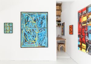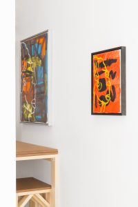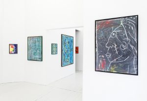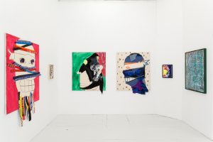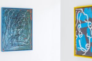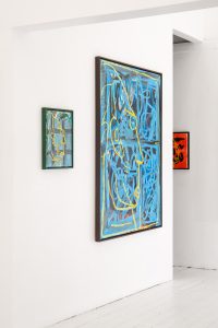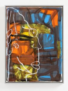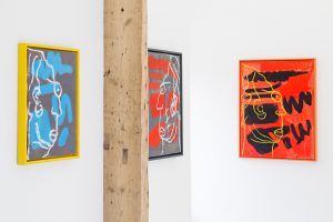 A pirate face is repeated in most of the paintings featured in Aww Yeah!. Quickly traced with oil—stick over the otherwise abstract and gestural canvases, the nature of this character is enigmatic, defiant and ironic at the same time. What this pirate symbolises is deliberately left open to interpretation and misinterpretation, as it is of no concern to a rebel what people might think of him. The nihilism and the disruptive power of this character emerge in the fast paced, obsessive repetition in which it is portrayed and sometimes erased. Its ubiquitous presence and self—assertion stand as a provocation and a dare to the viewer.