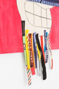 This series, which is presented for the first time in this exhibition, is combined with new takes on older works and with the introduction of formal elements unprecedented in Lukáč’s paintings. The long—lasting series of Ninja Turtles’ portraits is reinterpreted with textile interventions, which are appearing for the first time in his practice — hinting to the artist’s interest and current collaborations within the fashion world. The works in this show, emboldened by colourful, heavy frames are exhibited in an experimental and maximalist installation overturning and overpowering the gallery space.