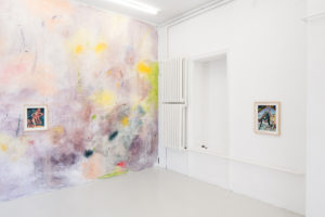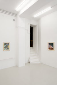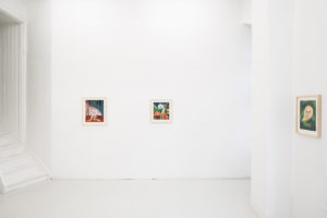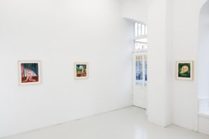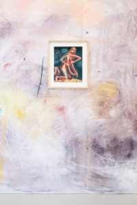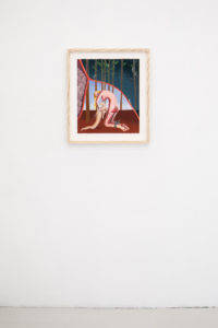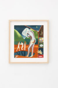 In a piece in the exhibition, one of the figures’ breasts elongate to pick a flower from the soft earth while they simultaneously catch butterflies with their ass cheeks. In other works, their legs can turn into mermaid-like fish tails and the exaggerated labia and curves of these characters emanate a joyful and unconstrained desire which —as the artist describes it— can only be created out of a bodily knowledge of sexual pleasure and the power this brings. And power is a key-word in these representations. The depiction of subjectivity, nudity and sexuality that the artist presents us with is empowering and free from social constraints, therefore refreshing and at the same time exhilarating.