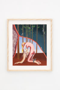 The characters of Sara Anstis’s works are feminine, often alone in nature, nude and liberated in their exuberant sexualities. In the scenes depicted by the artist they appear almost momentarily frozen, as if they were unexpectedly caught, or peeked at, in a moment of sensual intimacy or quirky daydreaming. This voyeuristic feeling derives partly from the fact that Anstis has, in the past, studied social groups as a sociology student and is herself a curious observer of her own characters, but also simply from the magnetic and fascinating otherness of this fantasy world which we are invited to peek in at.