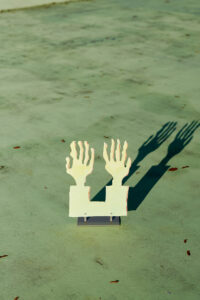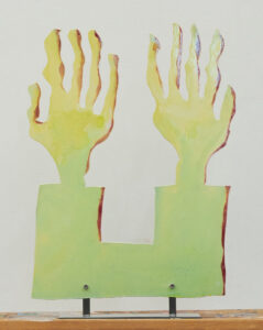 Marianne Hurum, Hender og Rådhuset (Hands and the Town Hall), 2020 (Lacquer coated aluminium on steel stand, 47 x 36 x 5 cm / 19 x 14 x 2 in).