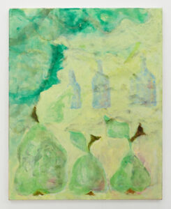 Marianne Hurum, Tre Pærer og Flasker, 2020 (Acrylic on canvas, 100 x 80 cm / 39 x 31 in).