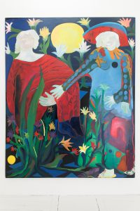 Italian artist Alice Visentin is exploring the possibilities of painting with her unique and larger then life depictions of mysterious and mystical characters, which recall ancient statues coming to life. The figures she paints inhabit what seems to be a timeless dream, playing musical instruments or dancing, wearing clothes from another time and place, while surrounded by a luxuriant, alien nature. From the depth of this oneiric scenery Visentin’s characters emerge like higher beings, inviting us to join them and lose ourselves in their own dream.