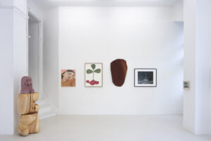 Sigve Knutson, Shotcrete Ceramics Small Dark Pink No. 2, 2024 (Stoneware, glaze, 38 x 33 x 22 cm), Pine Trunk Stool No. 6, 2024 (Pine, 47 x 45 x 43 cm), and Pine Trunk Stool No. 5, 2024 (Pine, 46 x 44 x 43 cm).