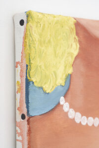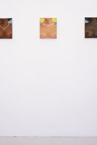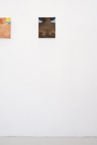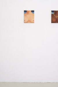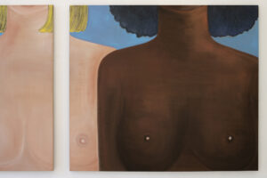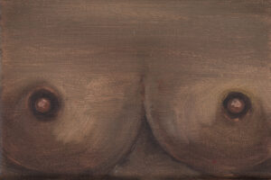 Kyvèli Zoi’s paintings are often details. Fragments of bodies, trimmed as if looking close enough to try and see through the images and into the very essence of the moments and people they depict. They reveal a world which is shattered but full, described more in its instants than by its continuity, motionless in what seems like moments of revelation, or reflection. Private and witty, these paintings often entail questions relating power and gender relations, but also lighthearted moments of everyday’s life. Initially focused on a more narrative and detailed kind of figuration, with colourful views, scenes and characters, often painted onto very large formats, Zoi’s canvases and subjects have become in the past years smaller and narrower. Details, mostly of female bodies, became almost the only subject, while canvases shrunk in size. With “Spectators,” Zoi is presenting the viewers with the most extreme result of this process, but a surprise too. The subject depicted becomes one and the same, reiterated seamlessly, and the canvases are some of the smallest she has ever painted. Surprisingly, however, these bitty oils on canvas are juxtaposed to one of her largest paintings to date. Almost 4 meters wide, Spectators,(1) magnificently takes hold and sets the tone of the whole exhibition. In this large diptych, what appears to be three women, different in their body type and ethnicity, stand next to each other, and their bodies, cropped by the canvas’ margins, are shown only from the neck to the belly. Only their bare breasts remain in the picture plane, and only breasts are the subject, in fact, of each and every work part of “Spectators.” They look back at us from the walls of the gallery space, powerfully imposing their presence in the room, in the inversion of roles between who is looking and who is looked upon which the artist wanted to suggest with the exhibition title. Eventually, by repeating her subjects indefinitely, Kyvèli Zoi does also something more with her images. She seems to aim to create what one could describe as new archetypes, odd and private archetypes like: that hand holding a cigarette in a thoughtful moment, the cocktail glass barely covering the forms of a naked body, or that feeling while looking into a fishbowl. This ‘archetype-isation’ might be read as an invitation to stop considering only the singularity of the very image in front of us, and surpass it in order to appreciate its higher essence, distilling the very prototypical form(2) it held for the artist. As such, this close up of breasts, looking back at us from the picture plane, becomes part of this vocabulary of idiosyncratic archetypes, in its beautiful and empowering clarity.