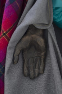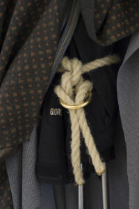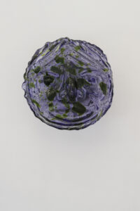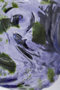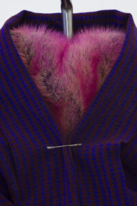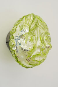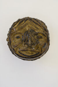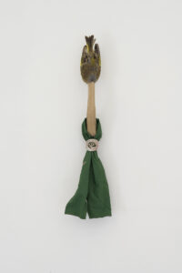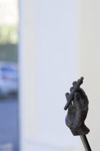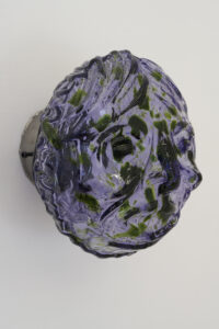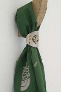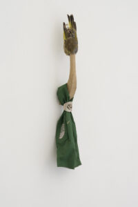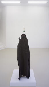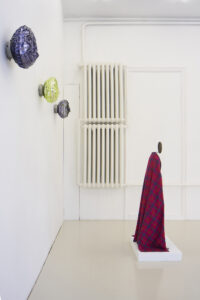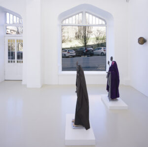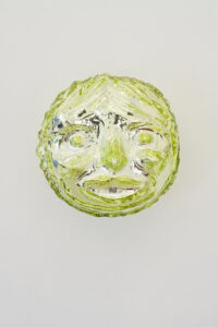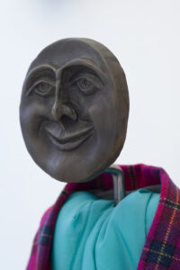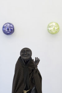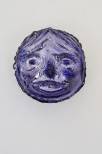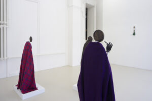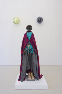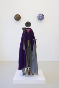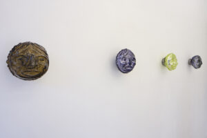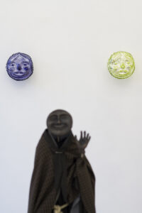 Four blown glass faces seemingly hover on the gallery wall while three life size figures dressed in capes take the centre of the room, all of them staring at the viewer, their features repeating, three in bronze and four in glass. These figures have a hauntingly sacred aura, they are dressed with dyed furs (an element dear to the artist for its deep connections to the Sámi culture), as much as with Gore-Tex technical clothing. Their build is composed of welded structures as much as by organic components such as alder wood, meanwhile each one of their faces appears in a play between its own features and its materiality bearing an expressive agency of its own. The relation with materials and crafts occupies a central role in Marsja’s practice as he associates their historical and contextual placement, and their aesthetic value in a manner that is ambivalent and permissive at the same time. He is playing with the idea of authenticity when silvering the glass, or attempting to give historicity to these objects by reiterating their features (as alluded by the exhibition’s title, Triple 4). Both of these operations seem to affirm that a tradition can be brought into existence without a past. The fluid meaning that Marsja attributes to objects and his tendency to discreetly add meaningful details to his sculptures, connects both to the animistic beliefs of the Sámi traditional spirituality, in which everything that exists in the natural world has a spirit and a life force in itself, but also to contemporary theories insisting on the intersubjective character of human and non-human relationships. Theories that aim to establish a new ontology that erases the existing barriers between human beings and animals and objects, between culture and nature. In his study intersecting object-oriented ontology and ecological studies, The Ecological Thought, philosopher Timothy Morton talks of the interconnectedness of all life-forms as a “mesh” made of ”infinite connections and infinitesimal differences,” a world not interconnected by a behind-the-scene mechanistic causality, but by a causality in-front-of the objects, as ”an aesthetic dimension of relations between objects, wherein sensory experience does not indicate direct access to reality, but rather an uncanny interruption of the false ontic equilibrium of an interobjective system.” Morton’s vision implies a counterintuitive and non-linear form of causality and interrelation between objects and our perception, and Marsja too, when associating Peppa Pig with animistic beliefs or Thomas the Train to a Mycenaean mask, seems to do the same. He follows a process ruled by an unfamiliar form of causality, by relations closer to naturalistic interpretations of our reality and to the entanglement informing such relations. And by doing so he manages to create objects that transmit an unexpected archeological feeling, a sense of historicity that has its roots in not one but many pasts, and in the present as much as in the future.
